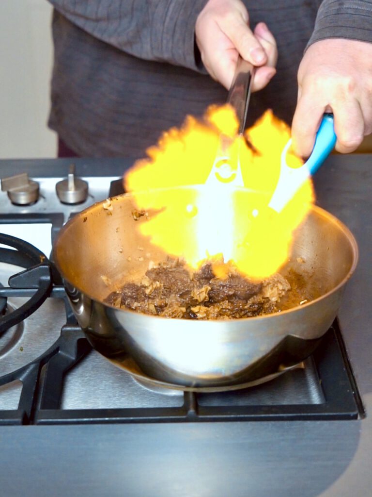 Flambieren: Die Pfanne und der Inhalt müssen sehr heiss sein. Immer die Pfanne vom Herd ziehen, bevor du Cognac entzündest.