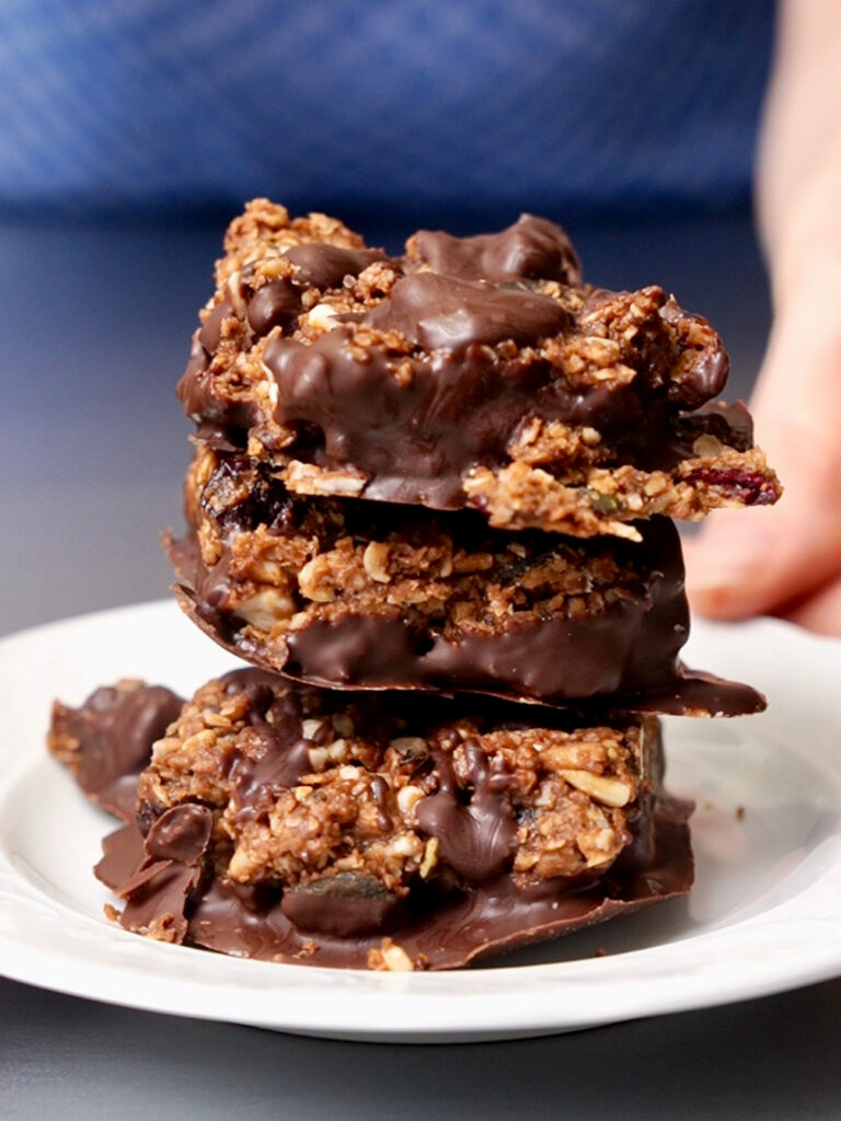 7. Optional Schokolade schmelzen und die Riegel beträufeln oder die Unterseite eintauchen, dann nochmals kurz kühlen.
