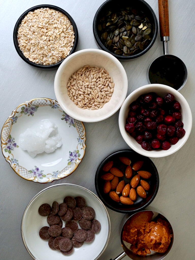 Mit 100 g Haferflocken, Kürbis- & Pinienkerne (je 35 g), 25 g Kokosflocken in der Pfanne kurz anrösten – 40 g getrockneten Cranberries Prise Salz – und als „Kleber“ 110 g cremiges Pistazienmus, 80 ml Ahornsirup + 2 EL geschmolzenes Kokosöl hinzufügen und ab in einer Auflaufform – 30 Minuten im Tiefkühler freezen .