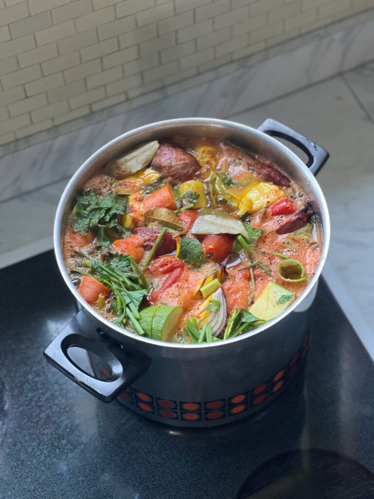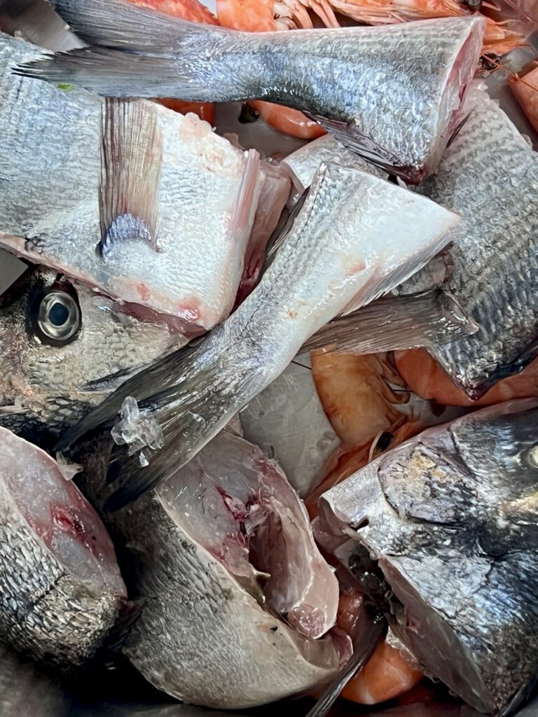 - Doraden zerschneiden und mit dem Gemüse sowie allen Zutaten wie 300 g Shrimps, Lauch (den grünen Teil), Zwiebeln mit Schale, Pfeffer (kein Salz!!!, da sich sonst nicht alle Aromen im Wasser lösen können – Osmose), Olivenöl, Weisswein, Petersilie, Karotten (gewürfelt), Paprika, Zucchini, Dosentomaten, Lorbeer, Knoblauch, Peperoncini getrocknet, Thymian, Rosmarin, Olivenöl, Essig und Safran in einen grossen Suppentopf geben und mit Wasser auffüllen.